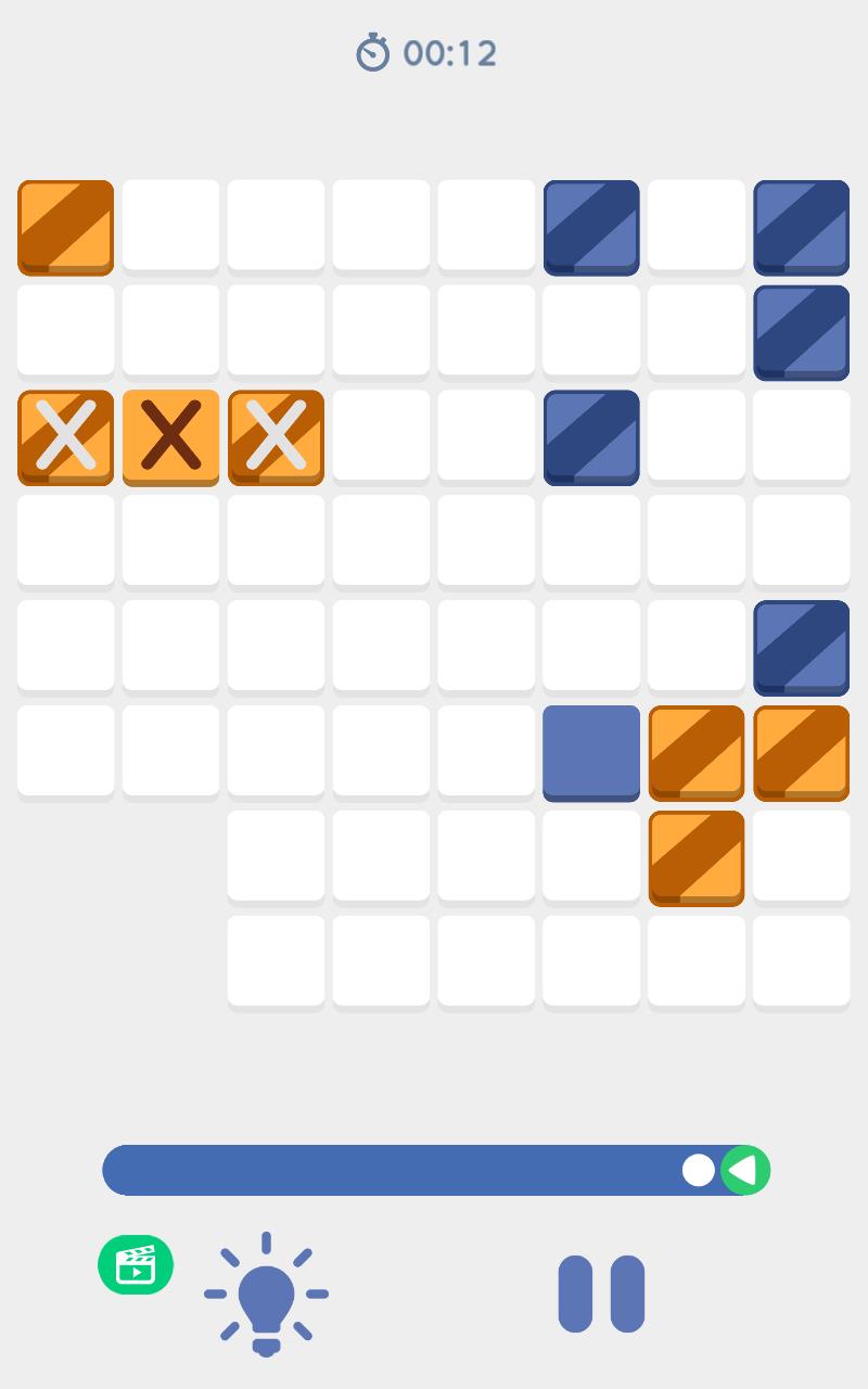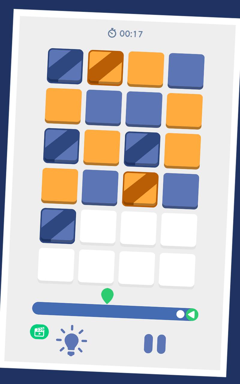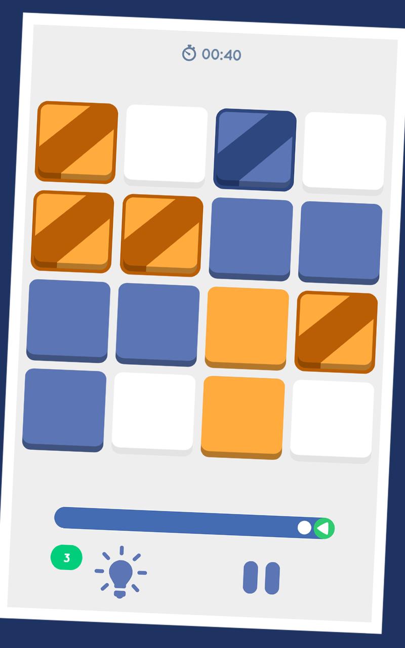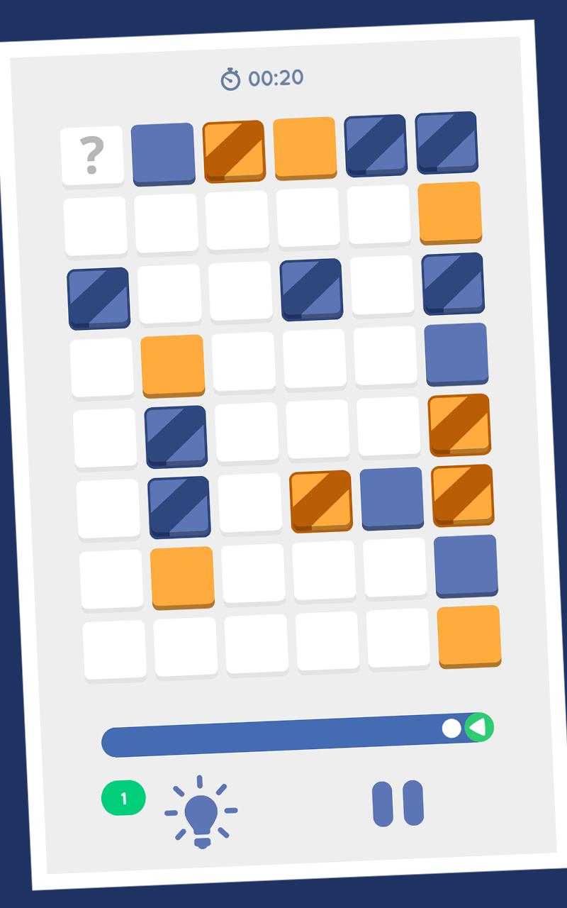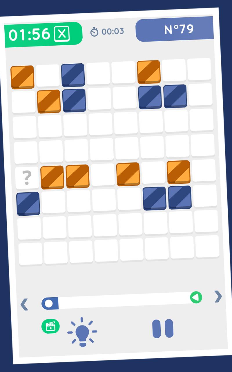 Also known as Binary Puzzle, the rules of this game are accessible to all. In order to win, you have to fill the grids with two colors. In a row or column, there has to be as much blue as orange and a maximum of two cells of the same color aligned. Finally, the rows and columns have to be unique, otherwise it would be too easy !