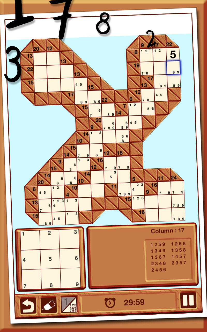 Kakuro, also know as cross sums, is a Japanese puzzle game which combines the Sudoku and crossword principles. Find the right combination of numbers whose sum is the clue written on the edge of the grid. Each digit must be unique in any given sum. You win the game when the grid is completed with the correct digits in every cell !